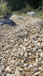 Wir hatten aber immer noch das Problem, dass das Wasser bei Trockenheit durch den Schnitt in der Folie aus dem Teich in den Untergrund versickerte. An heißen Tagen sank der Wasserspiegel um 10 cm. Dagegen schwamm bei einem erneuten ergiebigen Regen die Folie wieder an der Oberfläche. Es musst etwas geschehen.