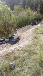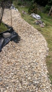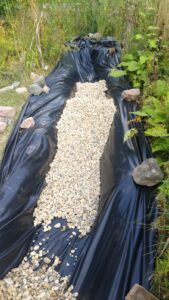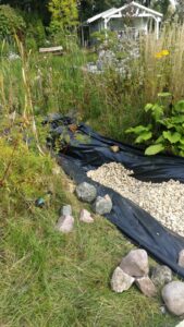 Der erste Bachlauf läuft vom oberen Rand unseres Grundstücks in den Teich. Der zweite Bachlauf sollte zunächst nur als Überlauf für den Teich bei Regen dienen. Aber auch hier überkam mich der Wunsch, einen zweiten, ständigen Bachlauf zu bauen. Gesagt, getan. Es folgen wie beim oberen Lauf: Furche, Rohr für die Pumpe einlegen, Sand aufschütten und Folie einziehen. Zum Schluss folgt der Kies und Staustufen mit Steinplatten.