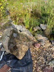 Für den Bacheinlauf wählte ich hier einen großen Quellstein. Im Teich wurde eine weitere Pumpe platziert und über ein Rohr läuft das Wasser über den Quellstein in den Bach und versorgt ihn so ständig mit Wasser. Bei Regen läuft der Teich an dieser Stelle ebenfalls über und füllt den Bach mit weiterem Wasser. Am Bachende wurde eine weitere Pumpe in einem Auffangbecken installiert. Über ein Rohr wird das Wasser wieder zurück in den Teich gepumpt. Dazu habe ich eine alte Bahnschwelle an den Teichrand gestellt und den Schlauch nach oben in die Bahnschwelle gezogen. Das Wasser läuft durch die Schwelle auf ein Stück Dachrinne in den Teich zurück.