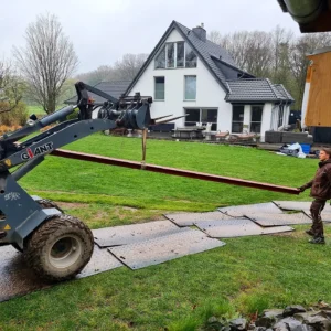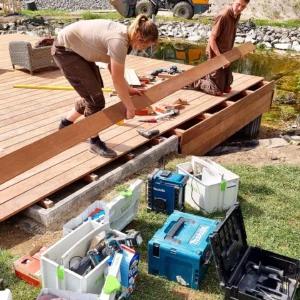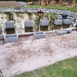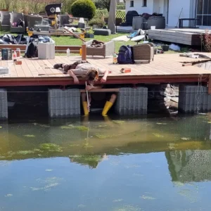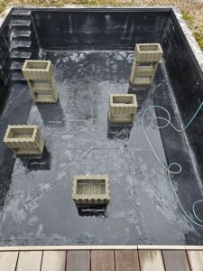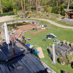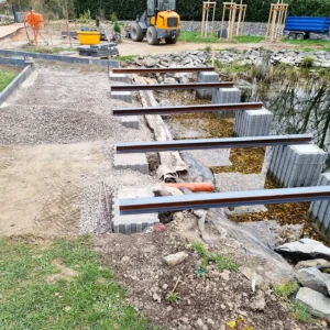 Im Jahr 2022 setzten wir uns daran, den Teich komplett neu zu gestalten. Ich wollte immer an einem schönen Sommerabend direkt am Wasser sitzen und dem Treiben am Wasser zusehen. 2022 ließ ich eine Holzterrasse über dem Teich bauen. Zunächst wurden Betonsteine im Wasser aufgebaut, die die Stahlkonstruktion halten, auf die die Holzterrasse aufgeleget wird. Da der Teich früher ein Schwimmbecken werden sollte, war bereits eine Steinmauer vorhanden. Darauf wurden die Betonstützen aufgesetzt.