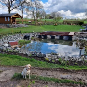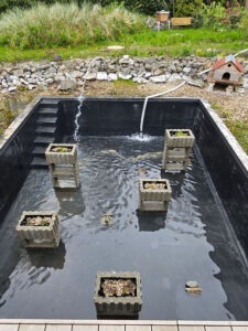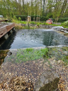 Ende April 2023 war dann endlich der Zeitpunkt gekommen: Wasser Marsch. Nach sechs Wochen Umbauzeit flutete der Teich mit 72.000 Liter Wasser. Dazu haben wir das Wasserrohr auf der Straße angezapft – natürlich mit Absprache des Wasserwerkes.