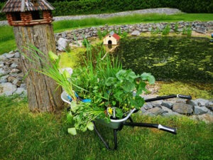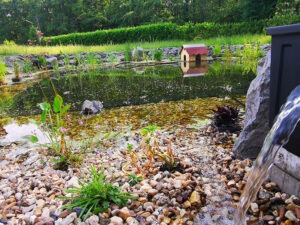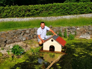 Im Juni 2021 zogen die ersten Wasserpflanzen im Teich ein: Rohrkolben, Sumpfdotterblumen, Hahnenfuss, Hechtkraut und weitere Wasserpflanzen. Um den Teich sauber zu halten, installierte ich eine erste Teichfilteranlage. Den stark wuchernden Algen ging ich – in einer Wathose gekleidet – mit einem Kescher an den Kragen. Neben den Pflanzen ließ ich noch ein Entenhaus zu Wasser. Jetzt sollte die Wandlung zu einem naturbelassenen Teich beginnen.