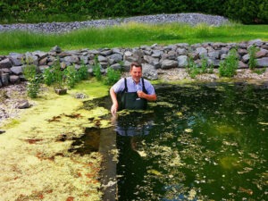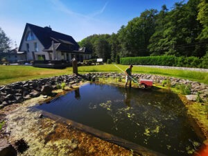 Seit der Flutung des Teiches bleibt der Wasserstand unverändert. Natürlich verdunstet im Sommer bei heißen Tagen auch Wasser. Aber wir haben direkt neben dem Teich einen 7 Meter tiefen Schacht, in dem sich Grundwasser sammelt. Dieser ist auch im Sommer nach zwei Tagen voll. Ich habe eine Pumpe im Schacht und unter der Erde mit dem Teich verbunden. Sobald der Wasserstand im Sommer fällt, wird das Grundwasser in den Teich gepumpt. Nach längeren Regenfällen drückt über das Rückschlagventil im Boden das Grundwasser in den Teich.