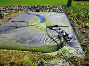 Sicher erinnern sich noch viele von Euch an die Flut – Juli 2021 – im Ahrtal mit über 100 Toten. Wir wohnen Luftlinie nur 100km vom Ahrtal entfernt. Auch bei uns hatte es um den 14. Juli 2021 wie aus Eimern über zwei Tage geregnet. Während ich mir im Juni noch über zu wenig Wasser und ein Loch in der Folie Gedanken gemacht habe, kamen wir am Morgen des 15. Juli in den Garten und fanden einen Teich vermeintlich ohne Wasser vor. Die Folie schwamm oben auf und unter der Folie befanden sich 50.000 Liter Grundwasser.