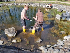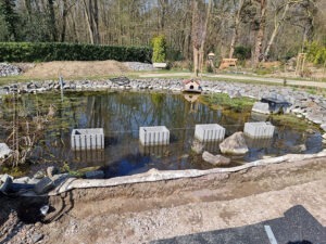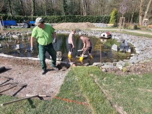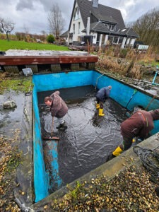 Nach intensiven Überlegungen und Beratungen entschied ich mich im Frühjahr 2023, die vorhandene Teichfolie um die Mauersteine komplett zu entfernen und flüssige Teichfolie auf die Steine aufzutragen. Im März 2023 begannen die Arbeiten und ich war sehr erstaunt, dass wir bei der Entfernung der Folie etwa 70 Kröten und 100 Molche aus dem Teich gefischt haben.