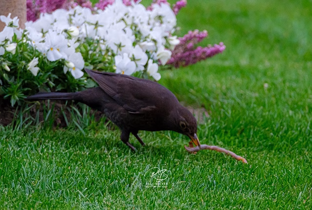 Amsel findet Regenwurm